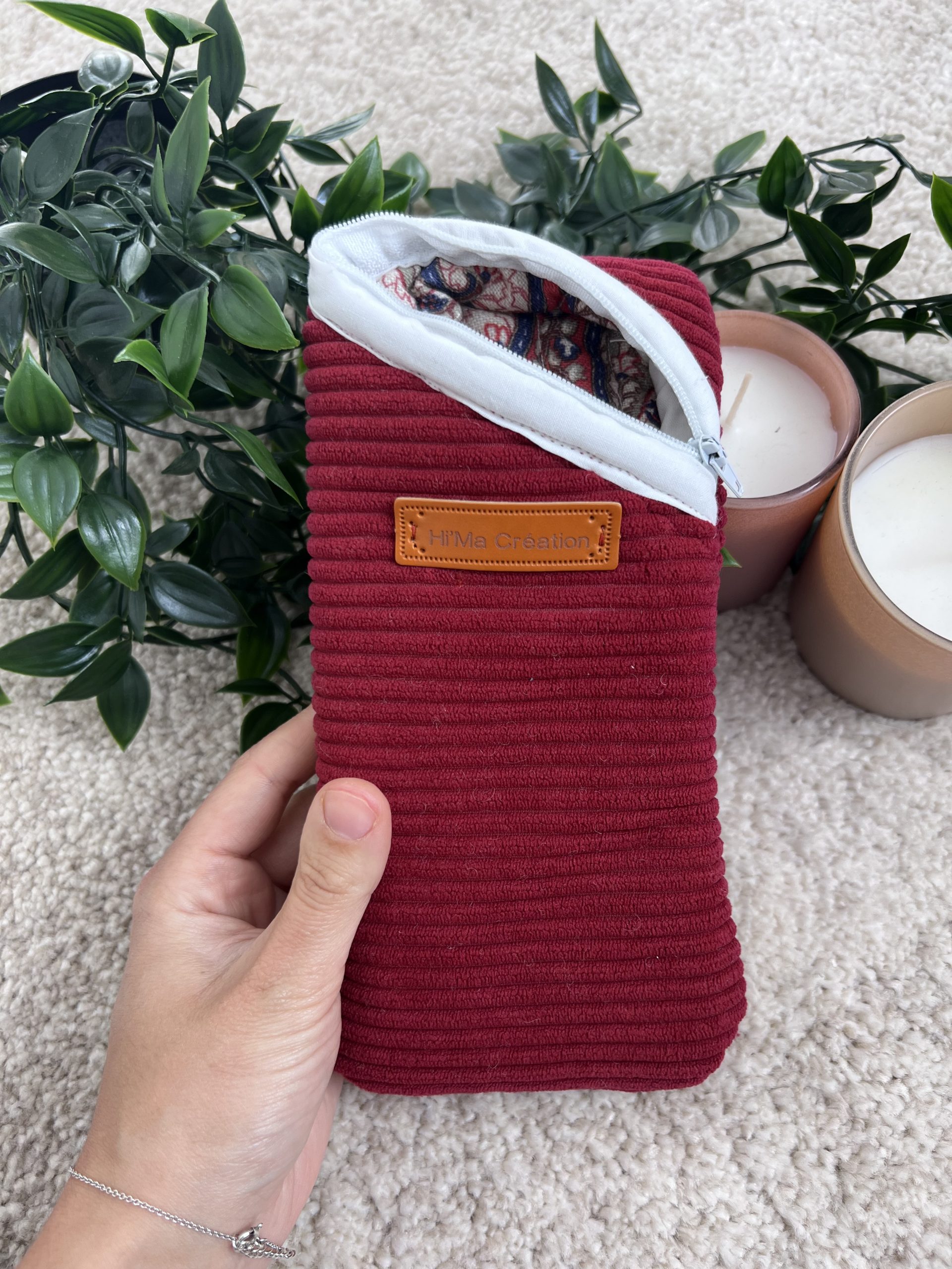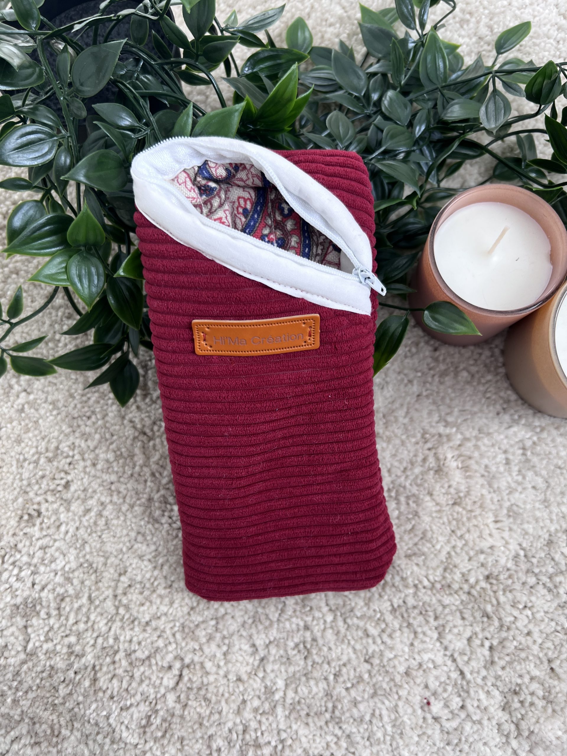 Son extérieur en velours grosses mailles bordeaux attire le regard par sa texture moelleuse et sa teinte profonde, tandis que son intérieur en coton et polyester matelassé beige, rehaussé de délicats motifs bleu et bordeaux, offre une touche graphique subtile et élégante. La fermeture blanche, discrète et lumineuse, complète l’ensemble avec douceur.