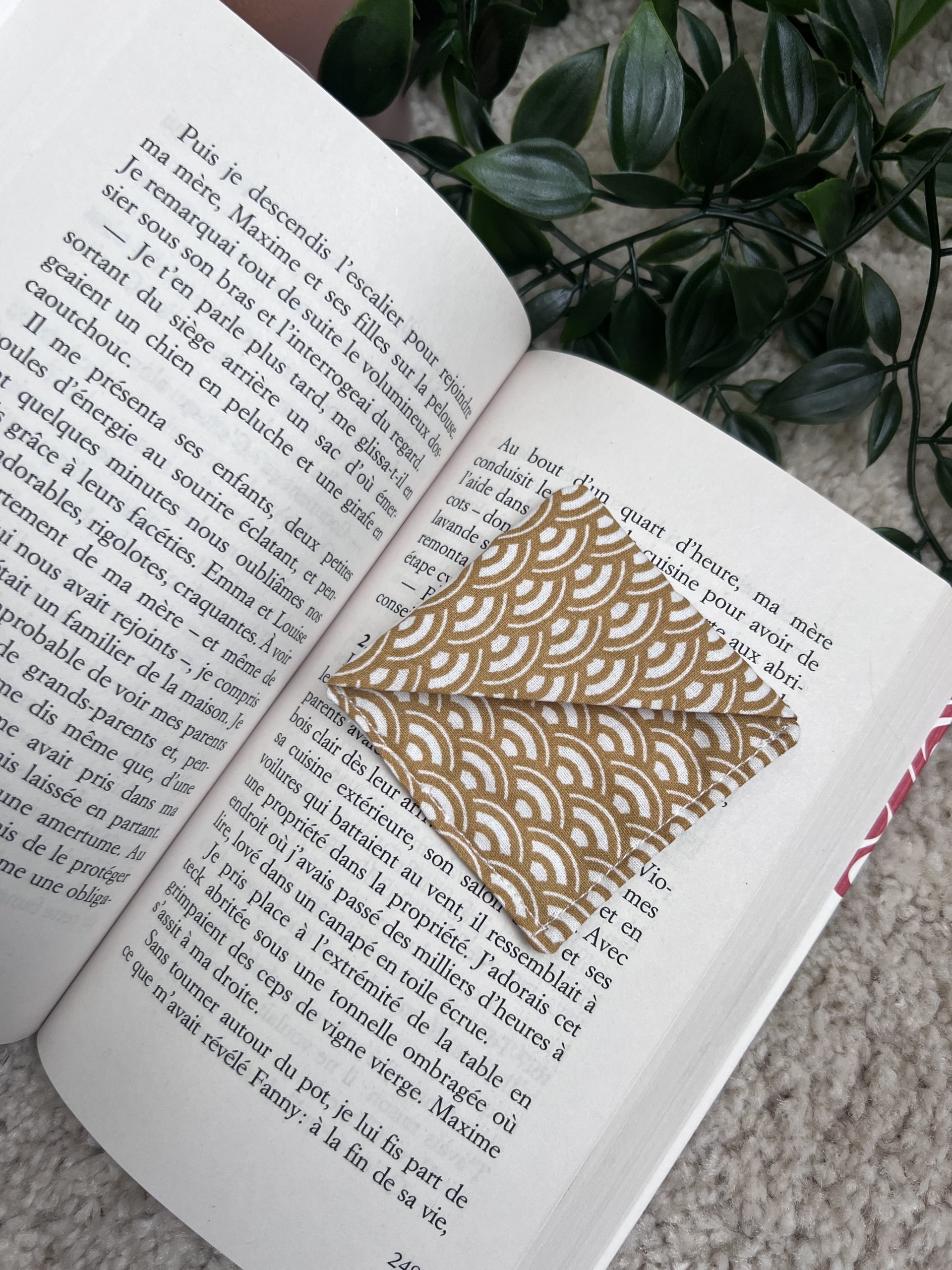Laissez entrer la couleur dans vos lectures avec ce marque-page triangle au tissu moutarde à motifs, rehaussé d’un dos uni blanc pour une alliance subtile entre vivacité et douceur.