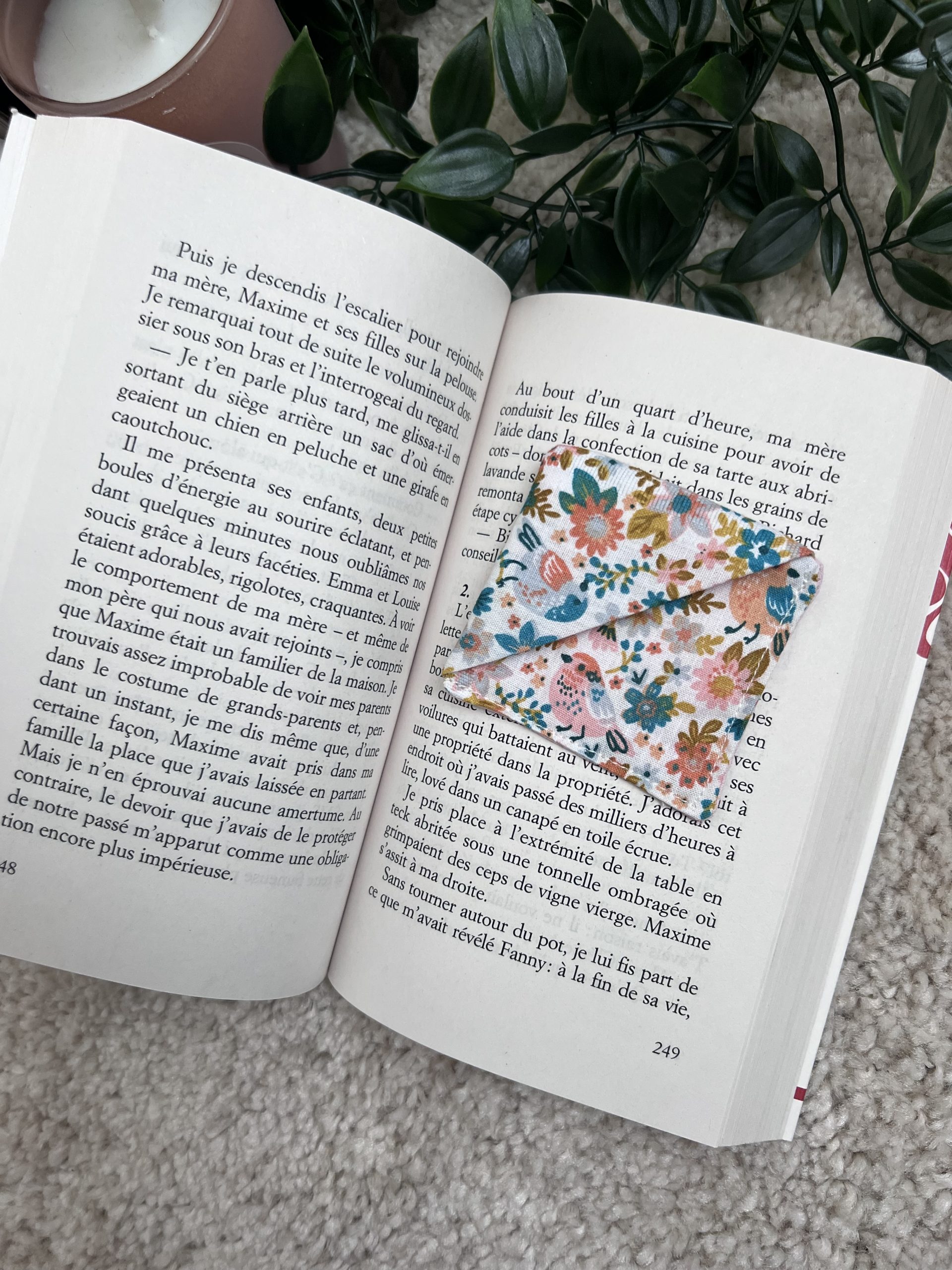 Marque-page tissu coton fleuris à motifs oiseaux (devant), tissu coton rose uni (dos).