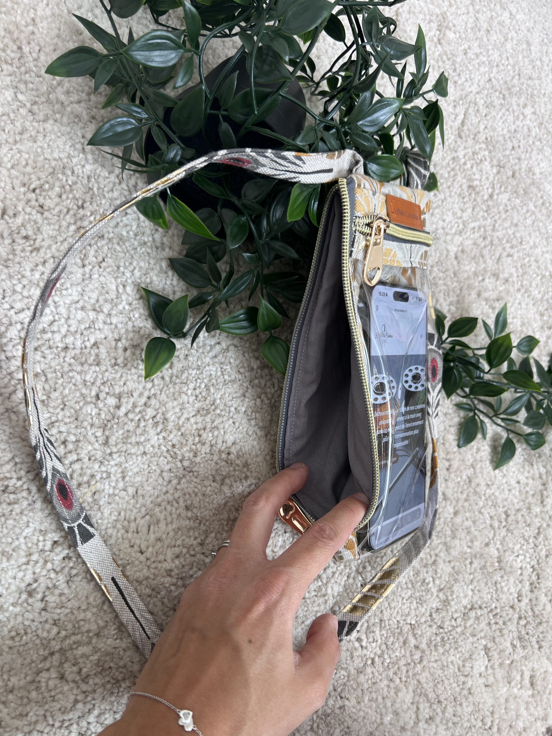À l’avant, une grande pochette transparente vous permet d’utiliser votre téléphone sans le sortir de son étui. Sur le côté, un compartiment zippé spacieux accueille tous vos indispensables : clés, écouteurs, cartes ou petit carnet.