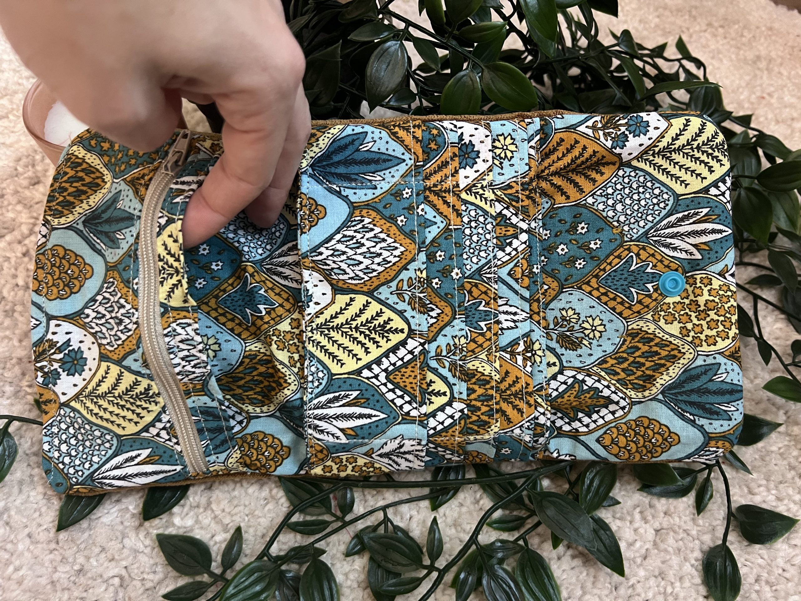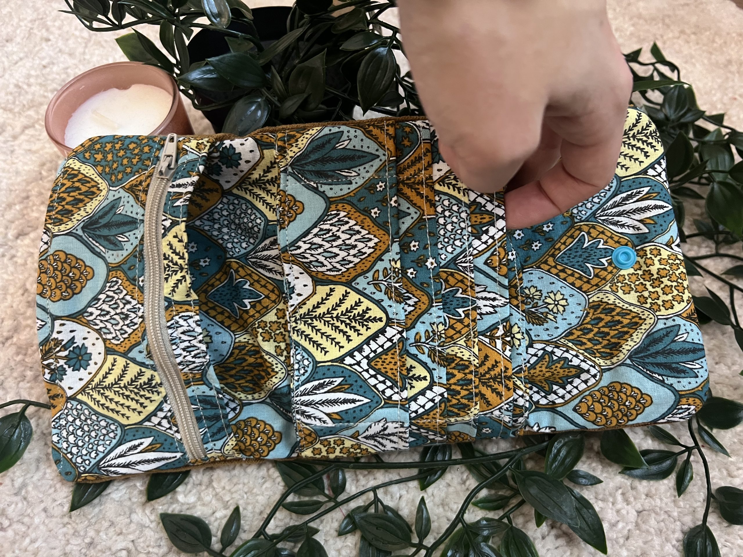 ✔ Tissu extérieur doré : une teinte lumineuse et raffinée pour un style chic et intemporel. ✔ Fermeture gris clair élégante : une finition douce et moderne. ✔ Bouton de pression bleu assorti : un détail soigné qui renforce l’harmonie visuelle. ✔ Doublure bleu moutarde à motifs originaux : un intérieur vibrant et plein de caractère.