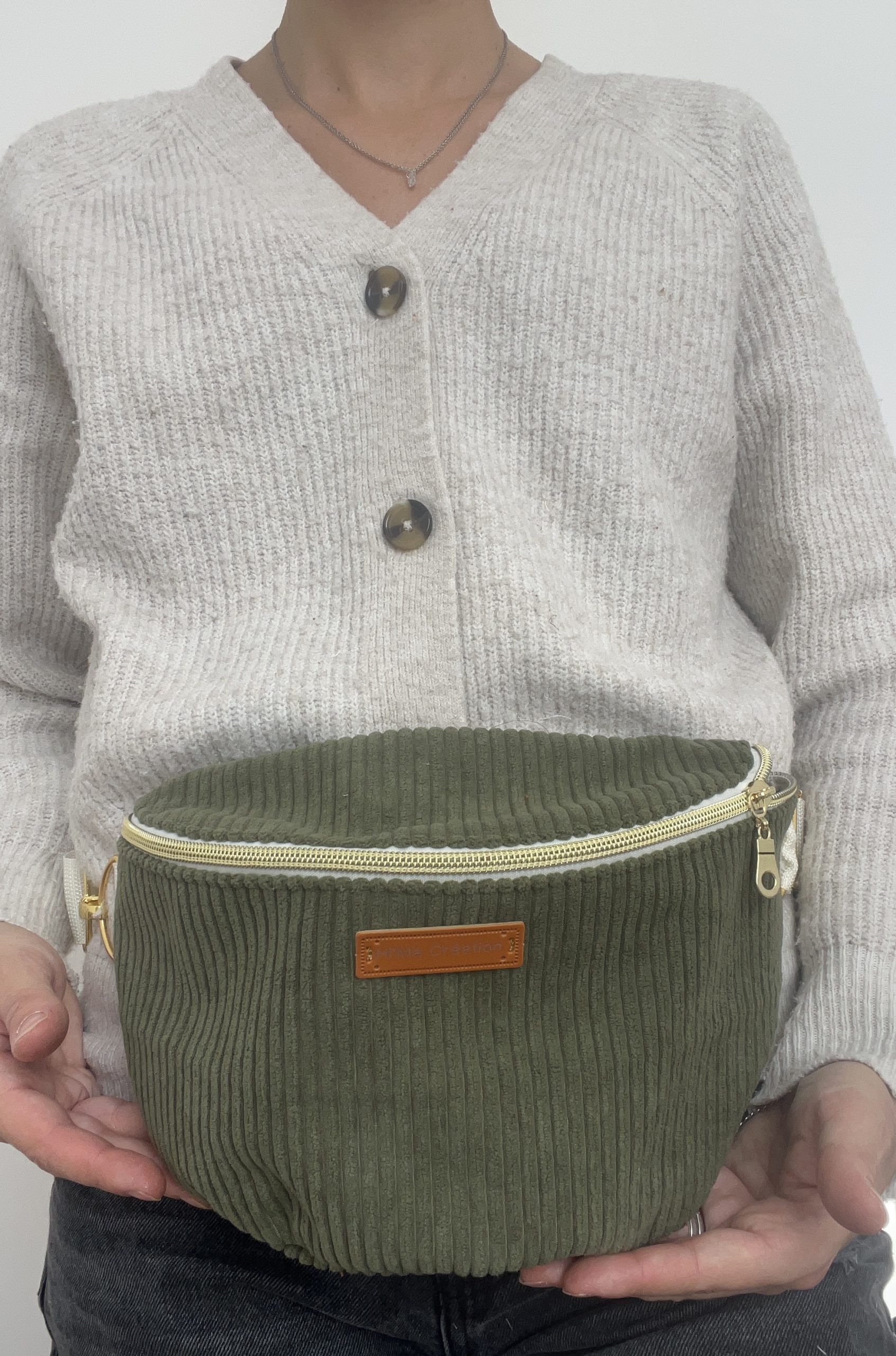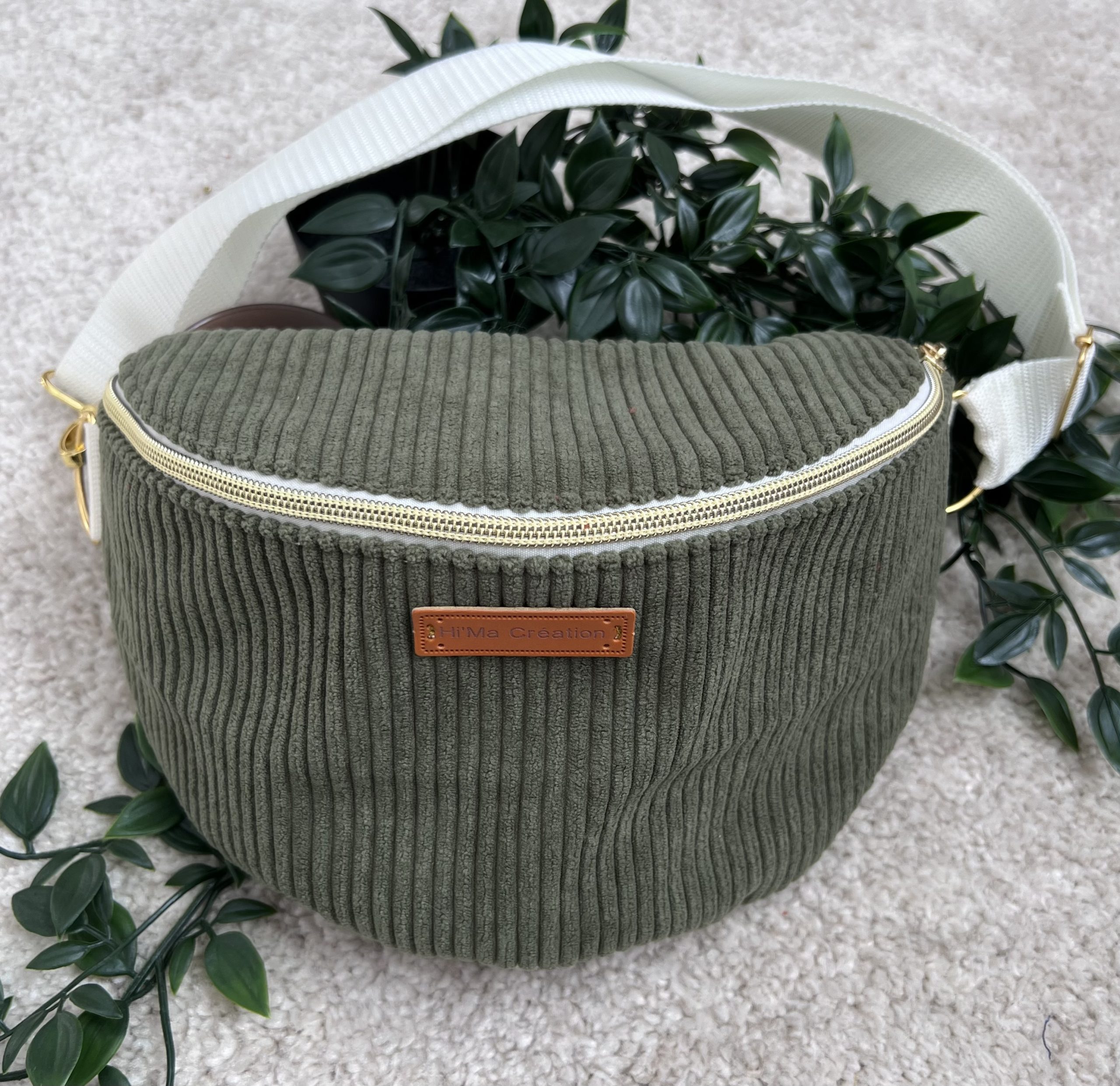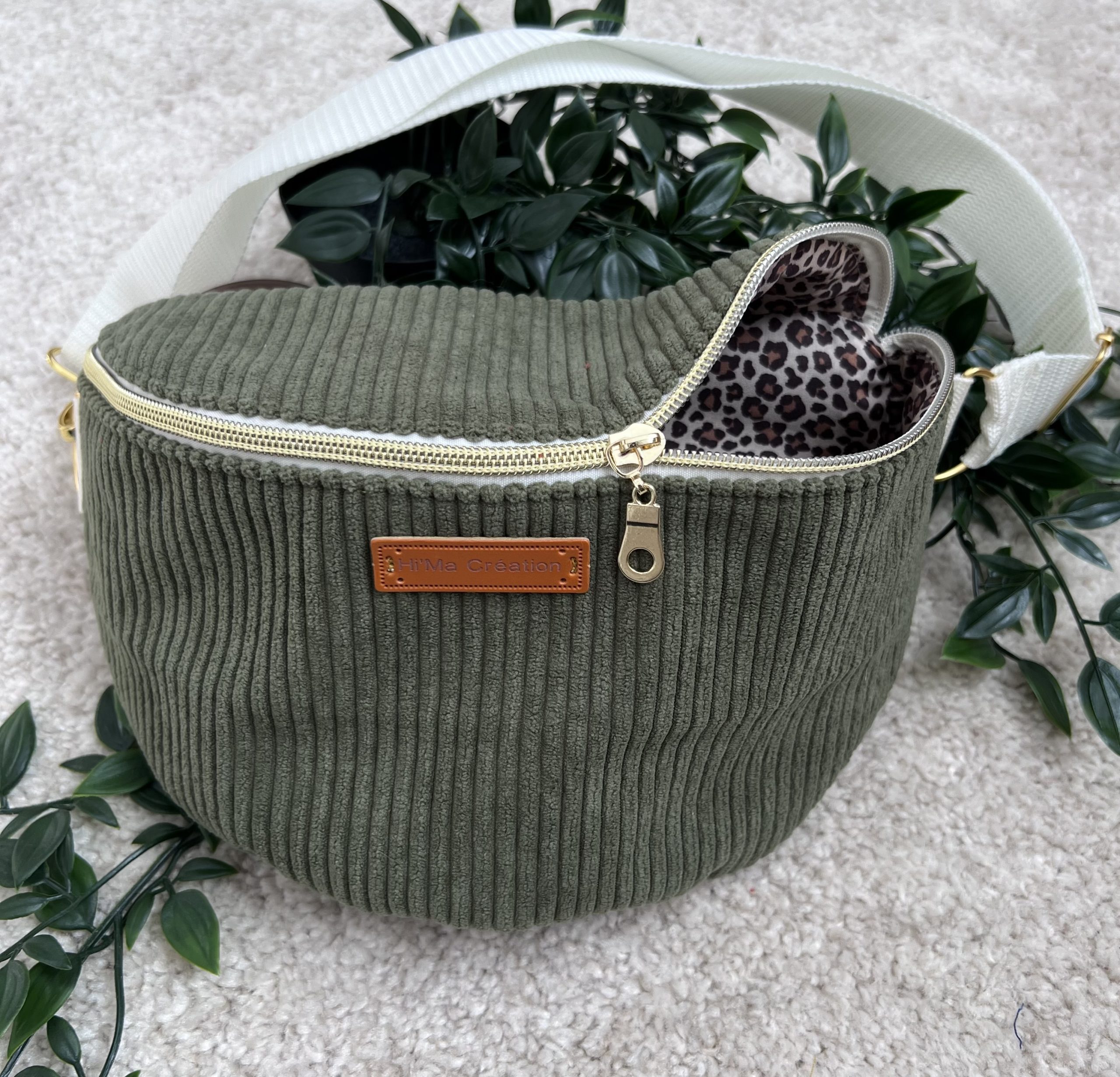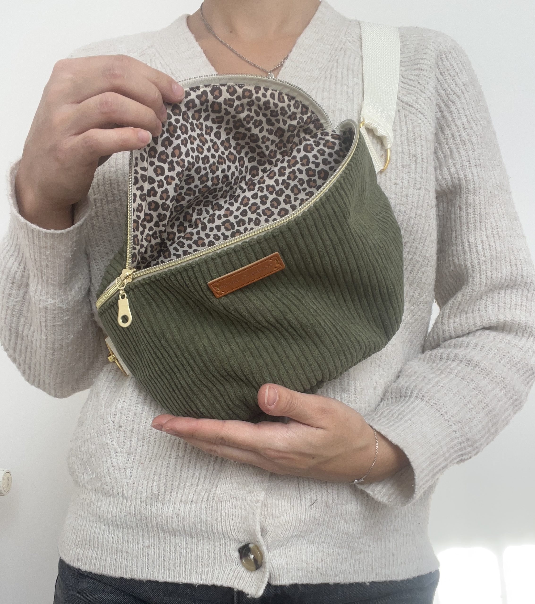 Sac banane kaki en velours (extérieur); Tissu coton Léopard (intérieur).