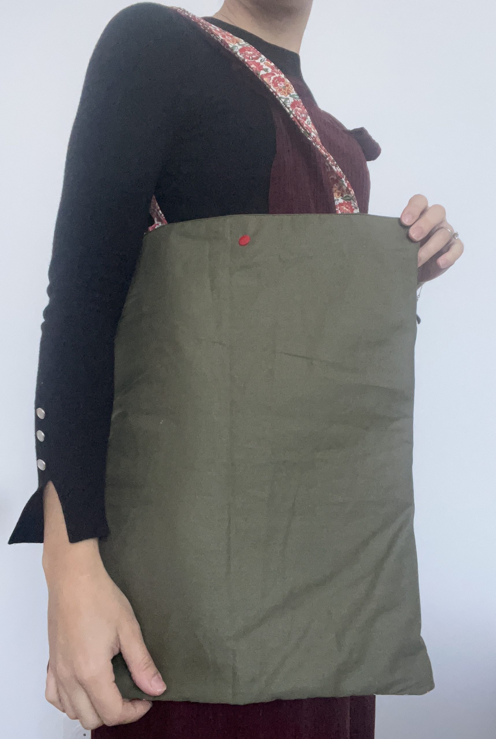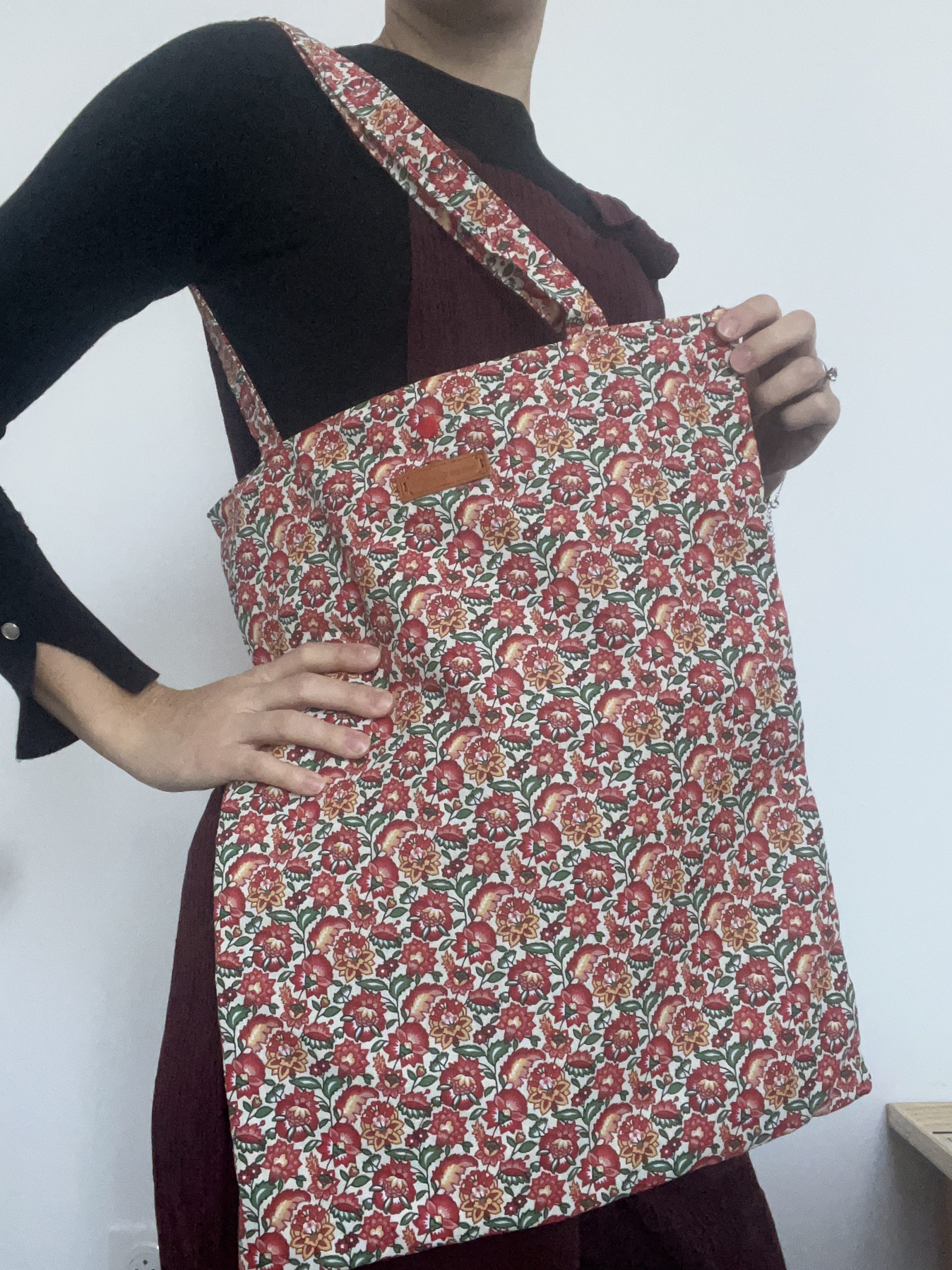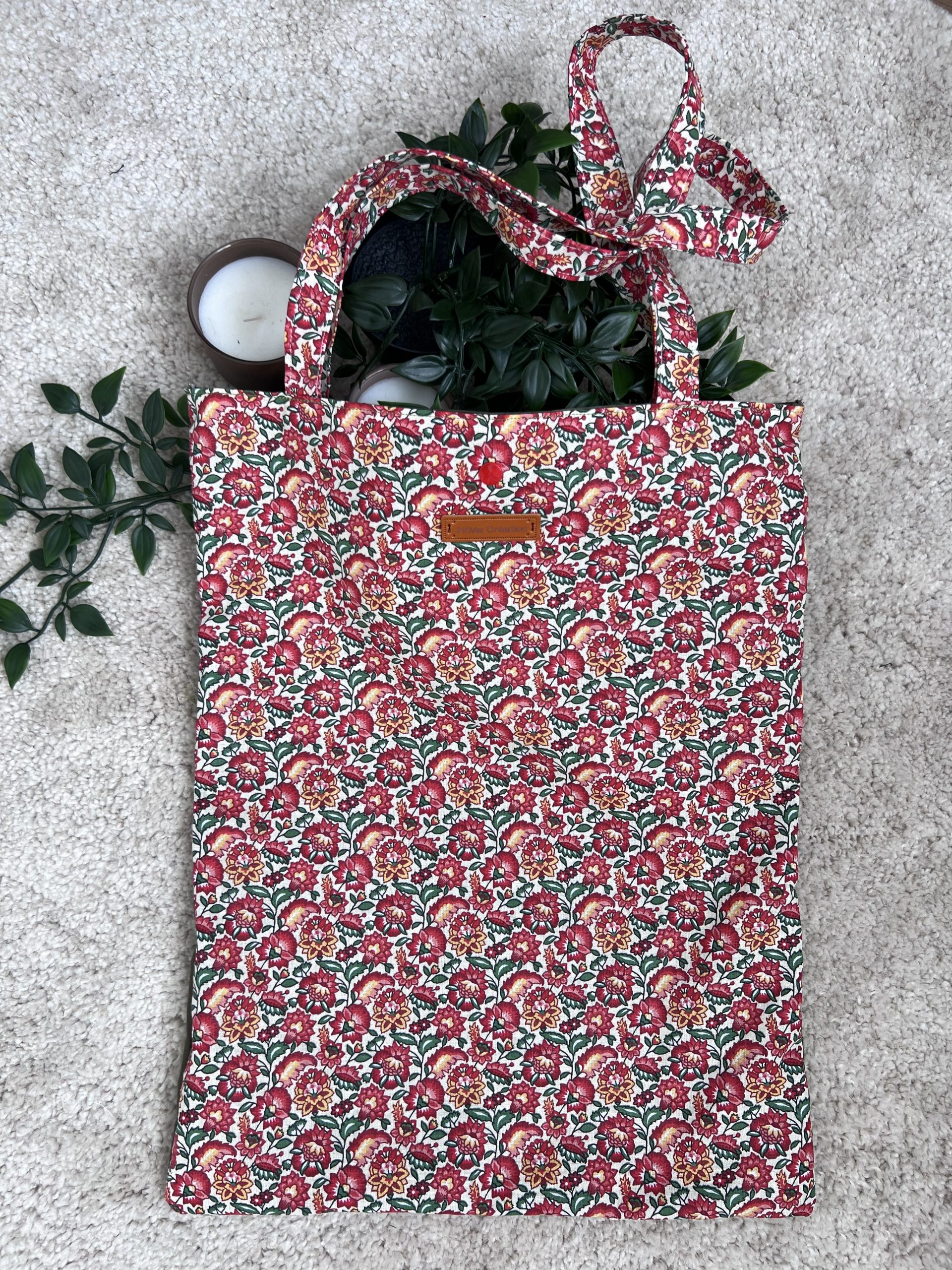 Pensé comme un compagnon du quotidien à la fois pratique et plein de charme, ce tote bag fait main associe un tissu fleuri en coton et un dos en coton vert kaki, avec une touche finale audacieuse : un bouton pression rouge. L’extérieur en coton fleuri apporte fraîcheur et légèreté, grâce à ses motifs délicats et sa palette de couleurs vivifiante. Le dos du sac, en coton vert kaki, vient subtilement équilibrer l’ensemble par une teinte naturelle et apaisante. L’intérieur reprend ce même coton kaki, créant une belle continuité visuelle et une finition soignée. La anse, confectionnée dans le même tissu fleuri que l’extérieur, renforce l’unité du design. Le tout est entièrement doublé pour assurer une belle tenue et une durabilité optimale. Le bouton pression rouge, vif et inattendu, apporte une touche de caractère et d’originalité.