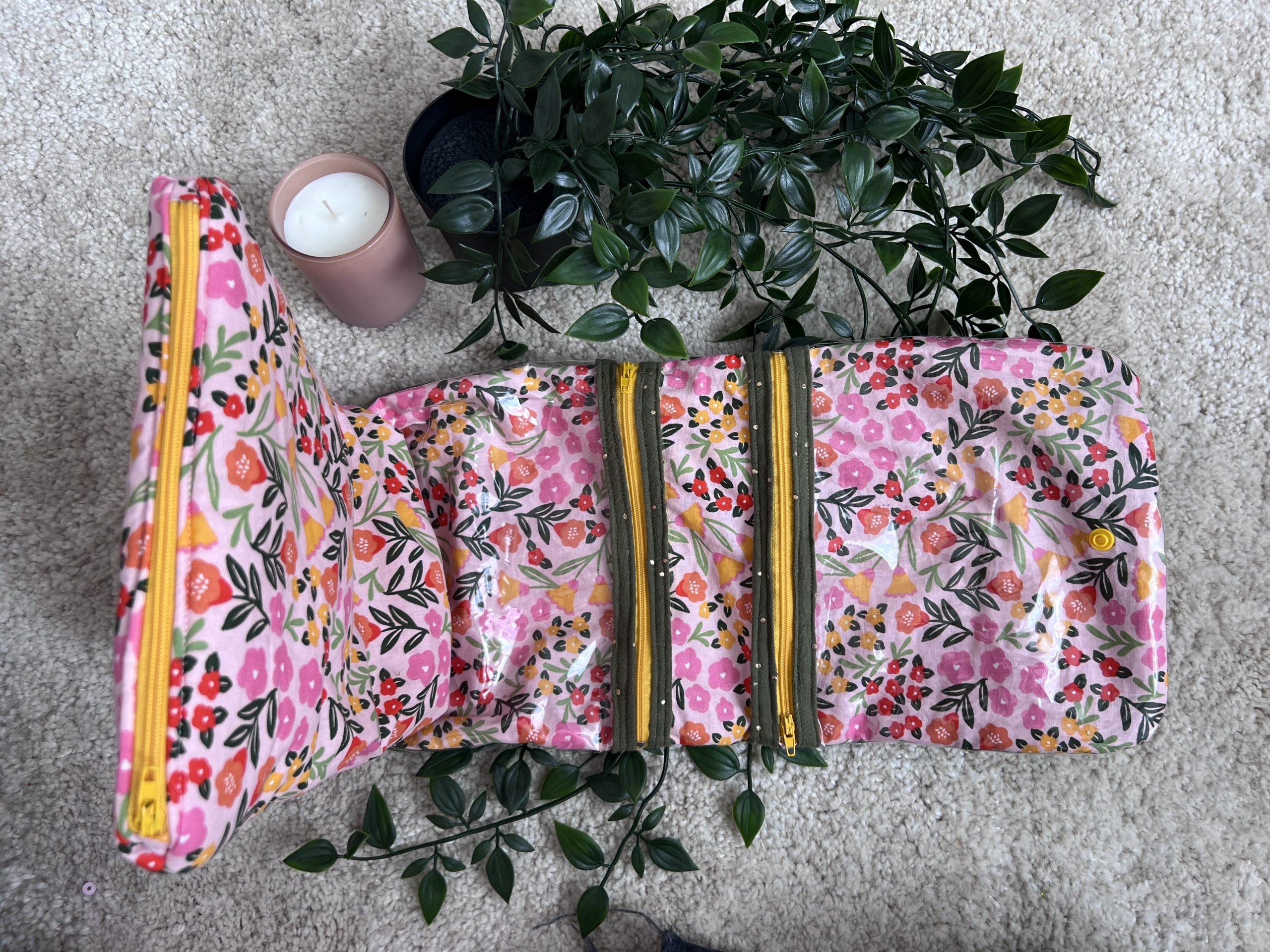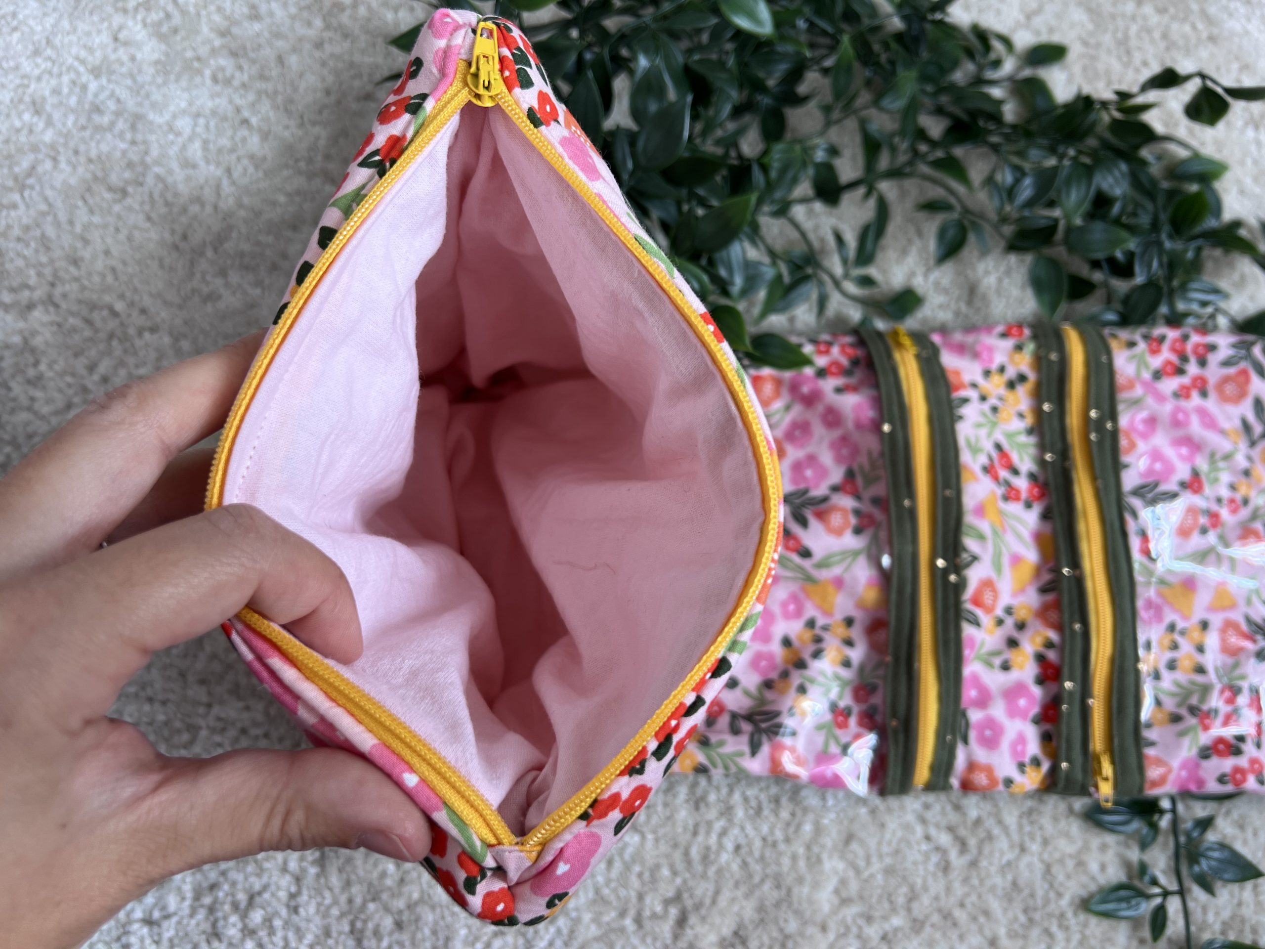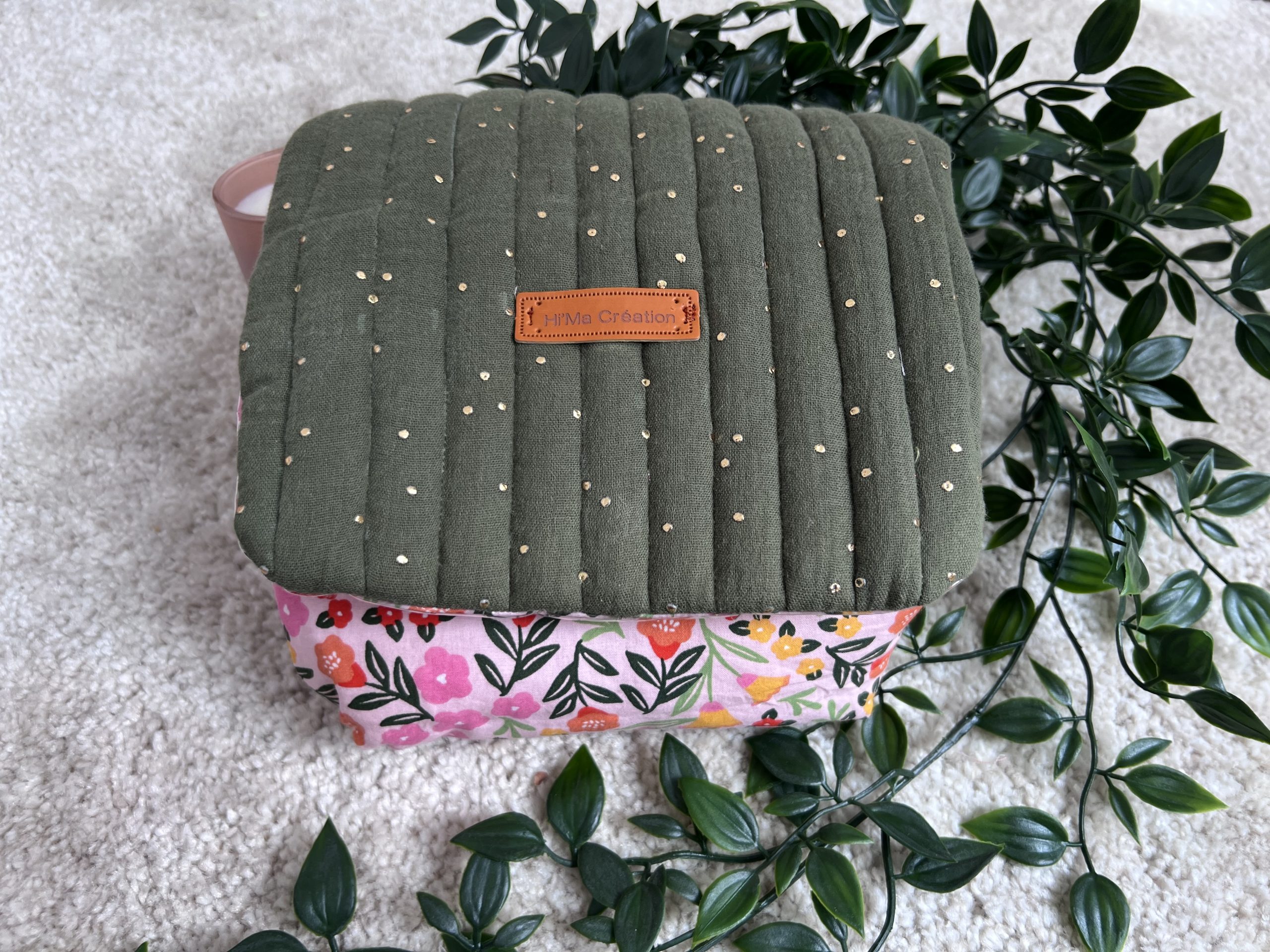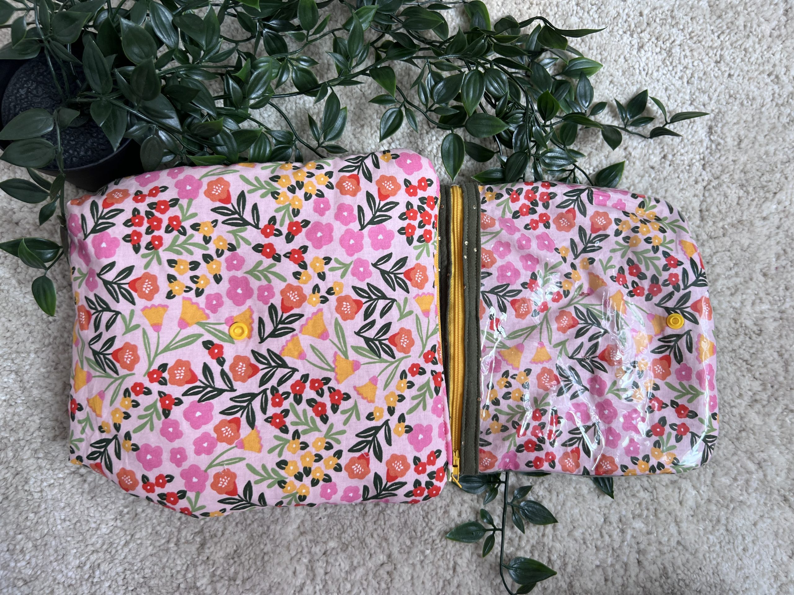Une trousse intégrée, en tissu rose à motifs fleuris à l’extérieur, et rose uni à l’intérieur, idéale pour séparer et protéger vos petits produits.